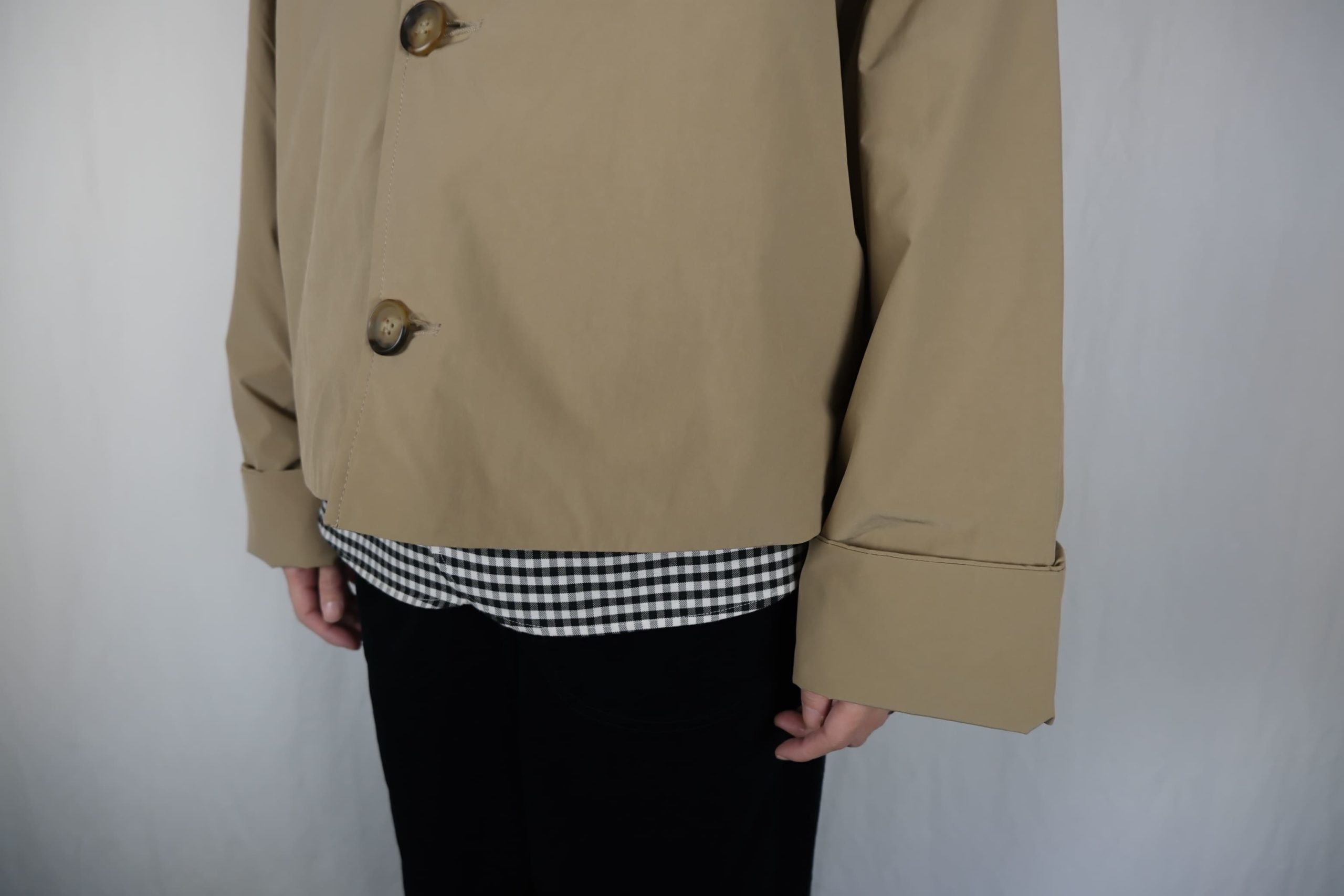 ・ワイドな身幅が特徴のショート丈カラーレスジャケット