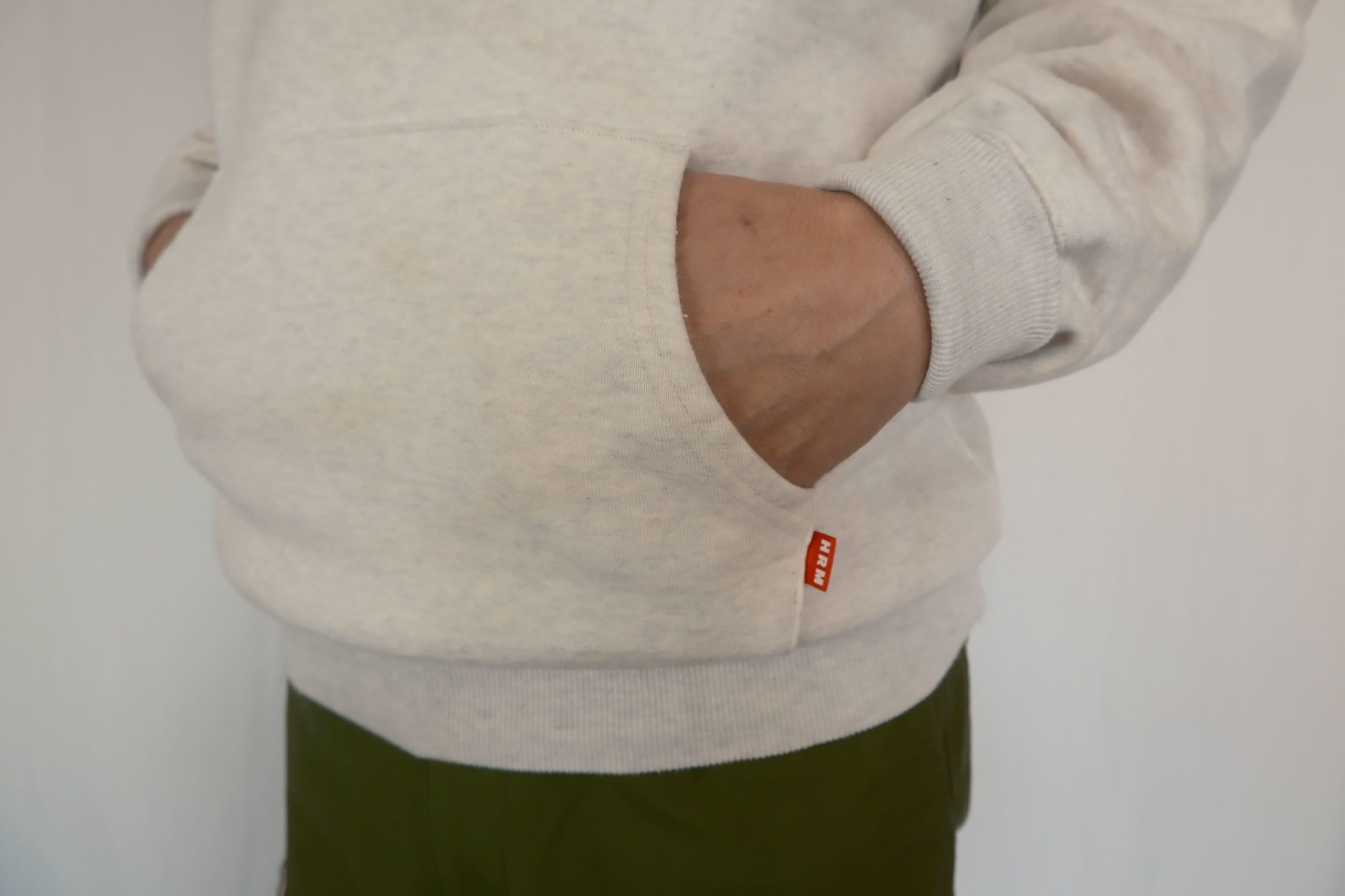 古着のような味わいのある加工感、フロントにあしらったカンガルーポケットもデザインとしてポイントになってます。