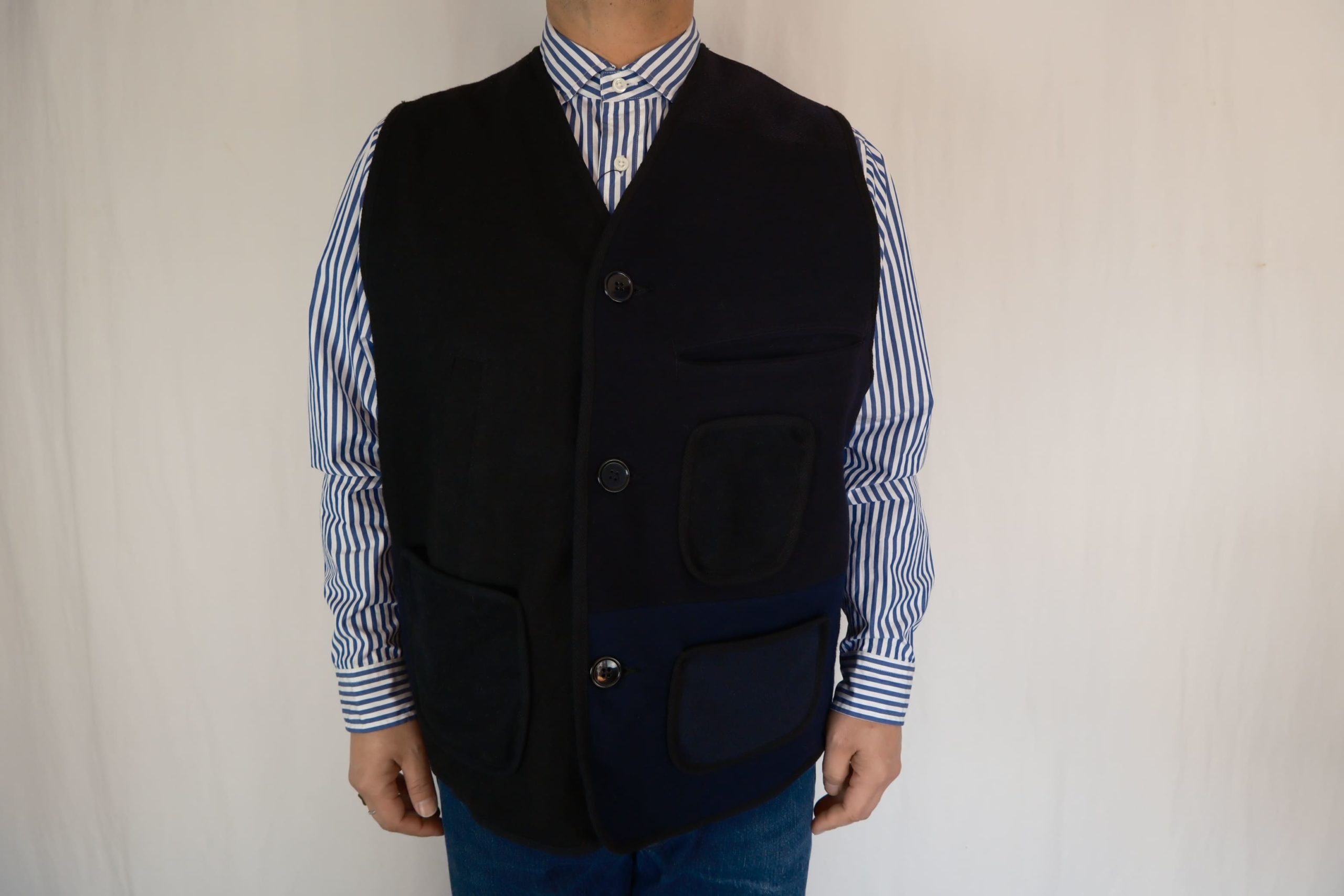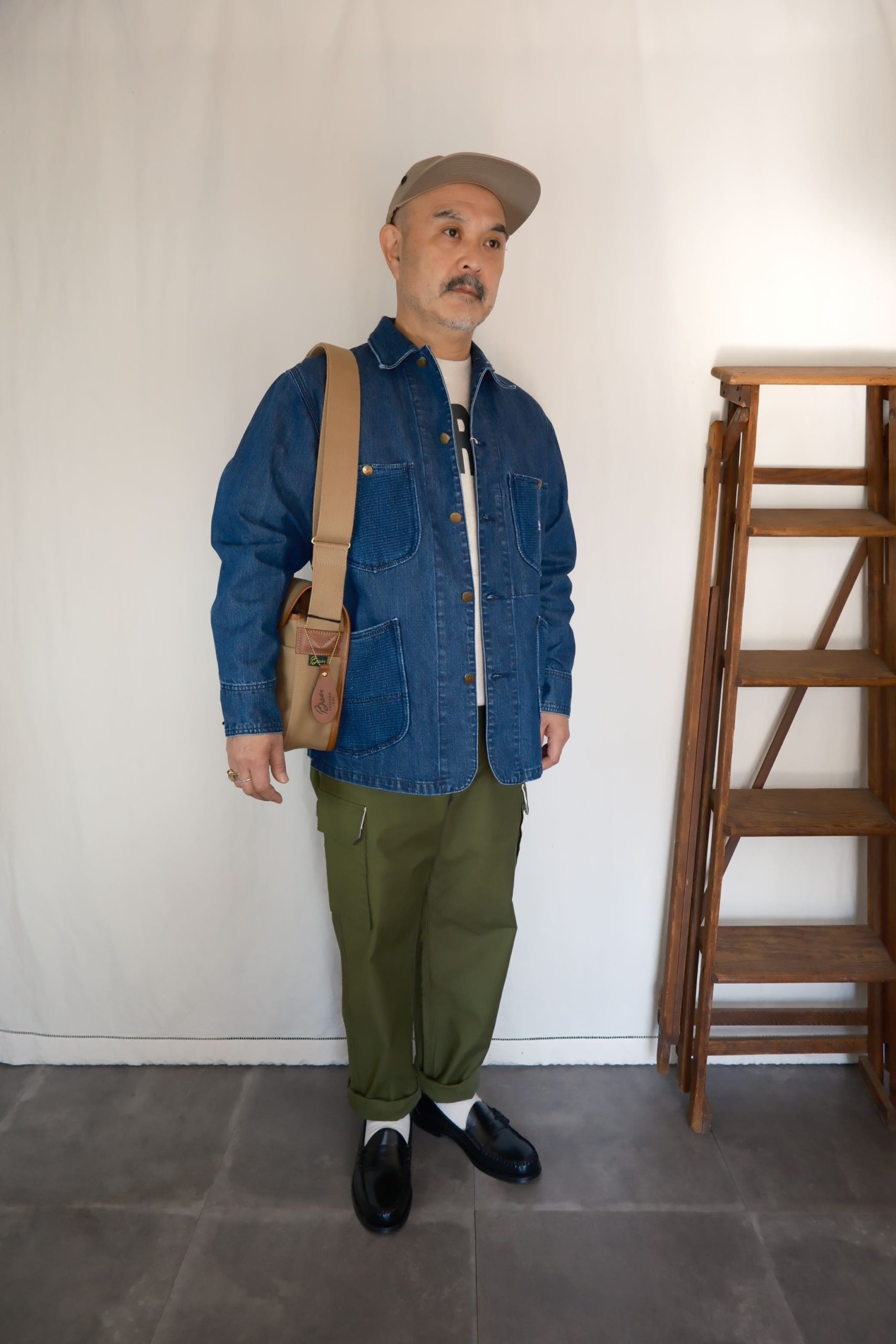 Leeを代表するカバーオールである91-Jをベースに、シルエットを若干Aラインに別注。右袖のボタンを一つアンカーボタンに変更し、使用過程で欠損し交換されたようなリアルな表情を演出しています。程良い色落ちのNAVYと、ハードに洗いこんだBLUEの2色展開は第一弾と同様で、ペインターパンツとセットアップになります。