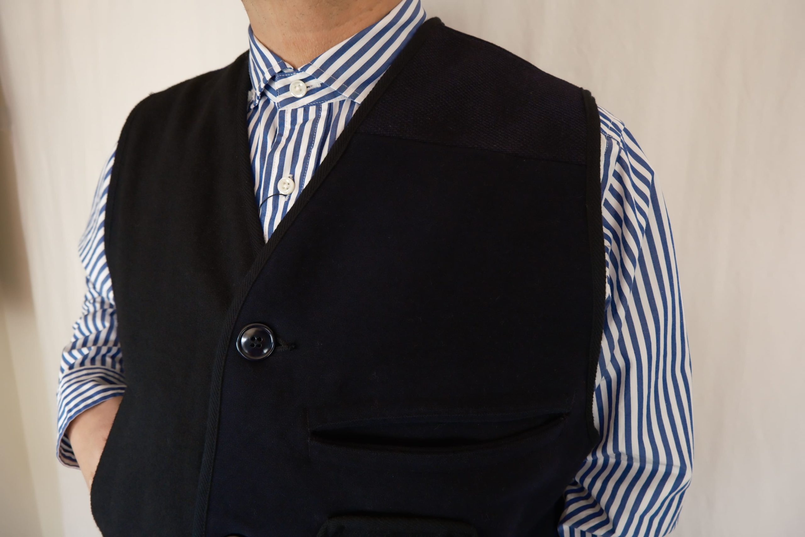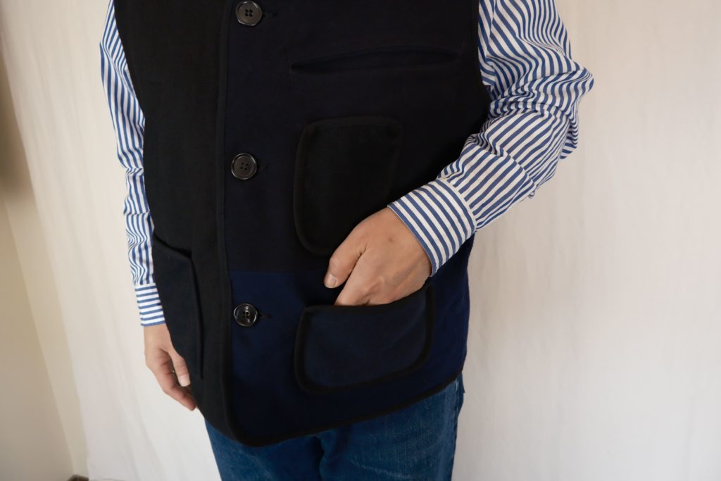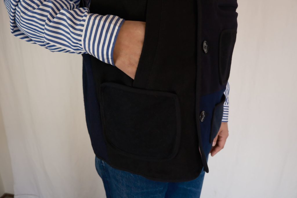 生地の表面にタテ糸のインディゴ糸が流れるように複雑な線となって表れた表情豊かなオリジナルデニム。もっちりと肉厚な素材で、ニットのような柔らかさも併せ持っています。生地の表面に多くタテ糸が出ているので、生地のひっかけに注意してください。衿・ポケットに使用しています。