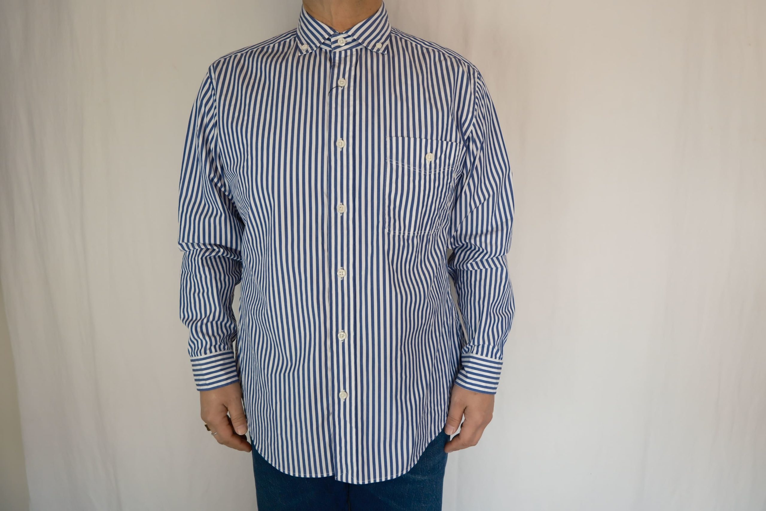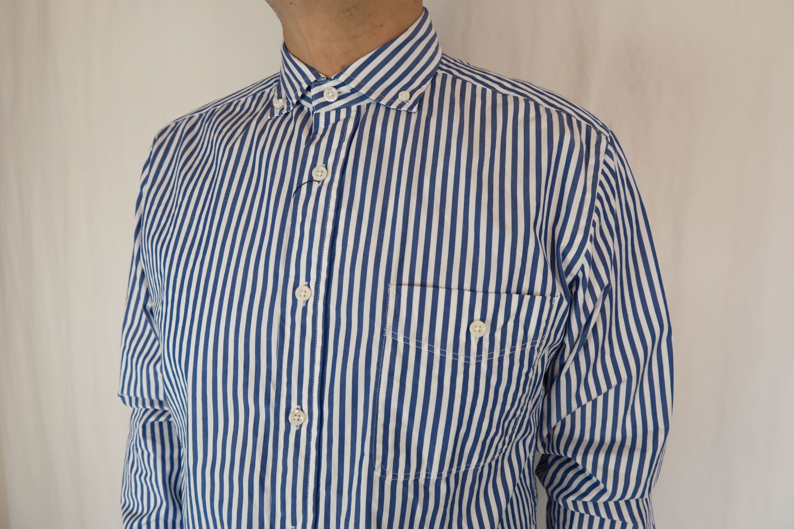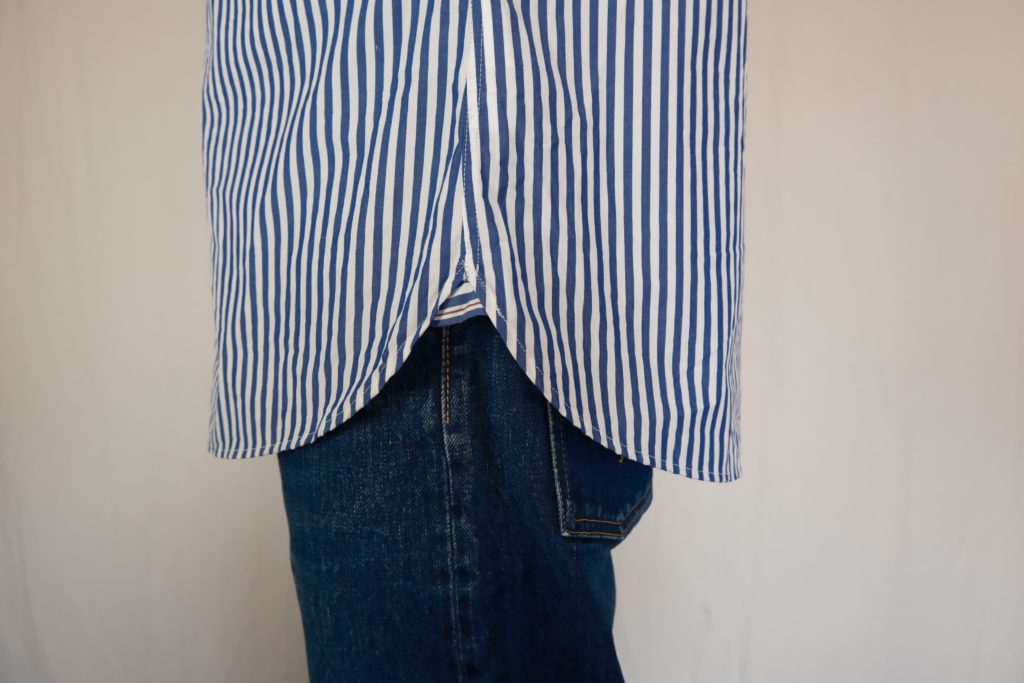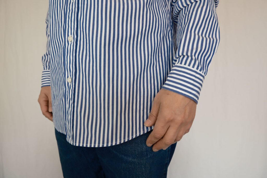 生地には、バスクシャツ特有のハリ・コシと目ズラの美しいツヤ感を引き出すため、限界まで高密度に織り上げた素材を使用しています。