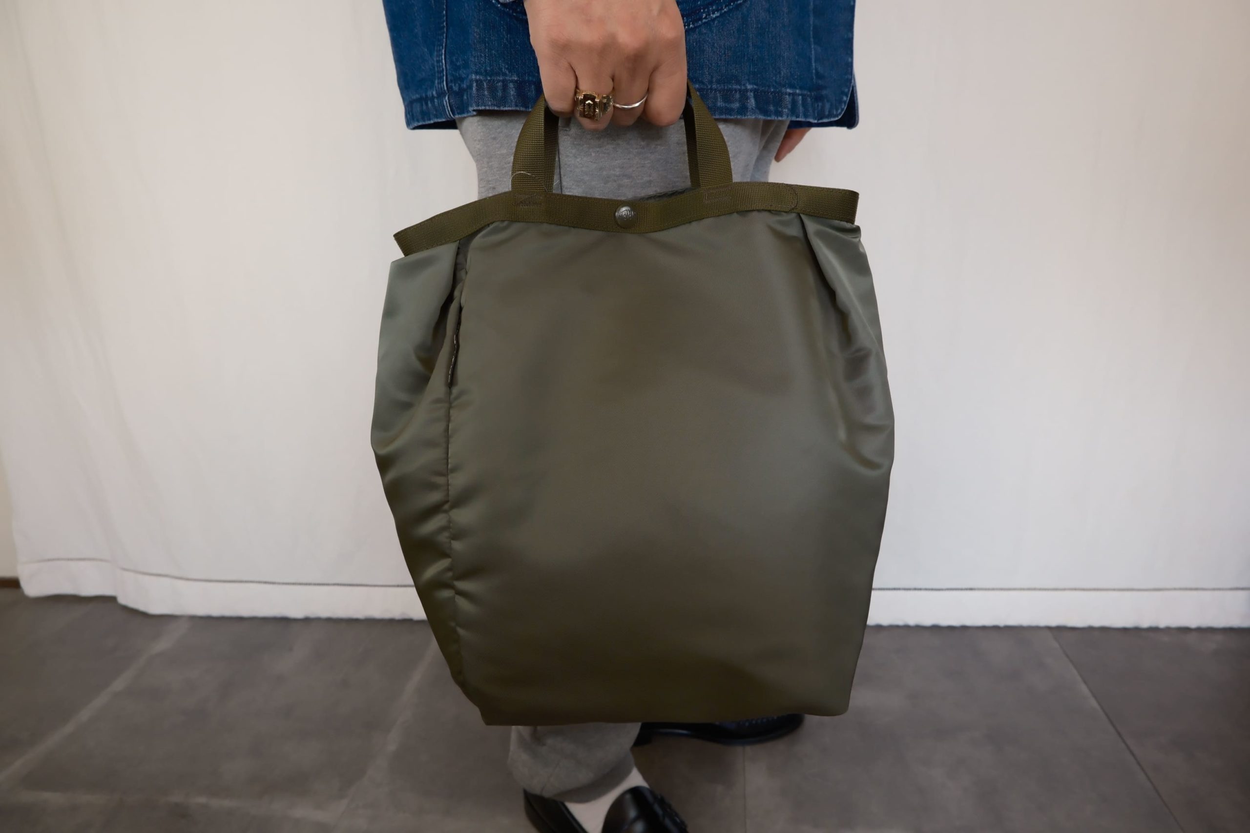 1枚の生地を折り紙のように縫製して縫い目の印象を抑えたミニマムデザインなトートバッグ。