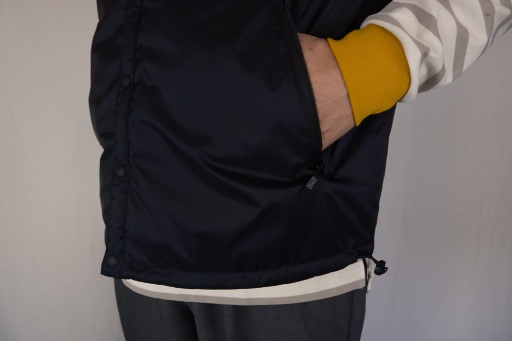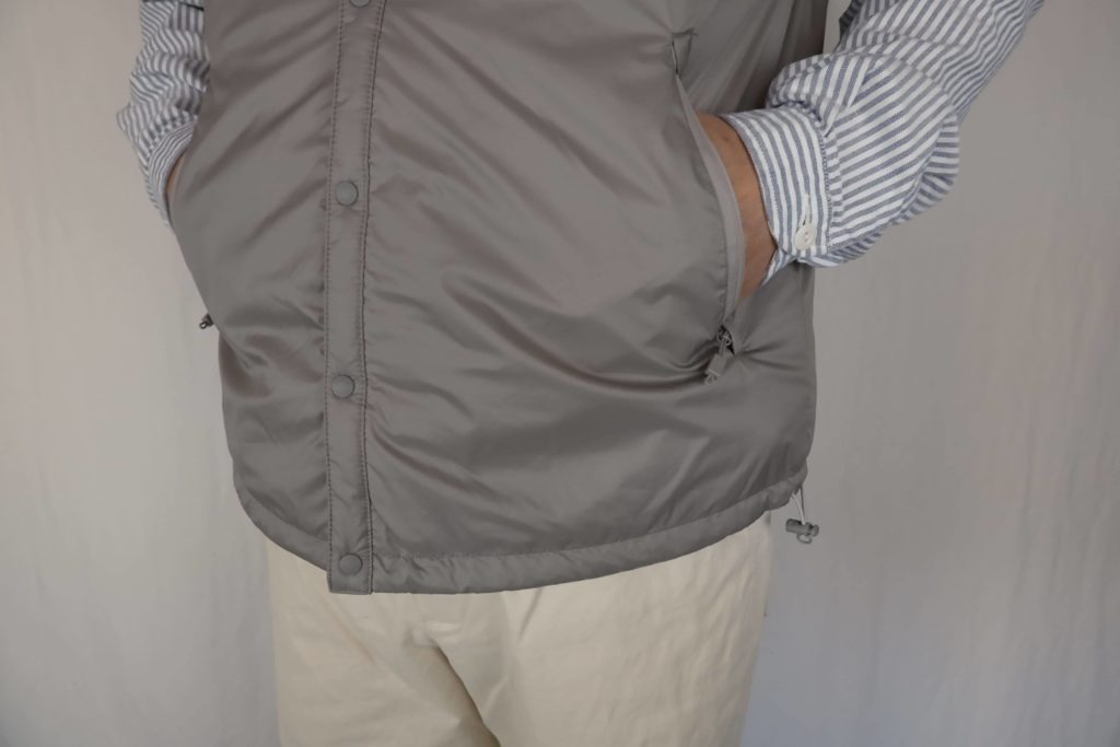 プリマロフト中綿を使用した、薄手のノーカラーベスト。襟がないのでシャツやニットの襟元を邪魔せず、どんなスタイリングにも馴染んでくれます。