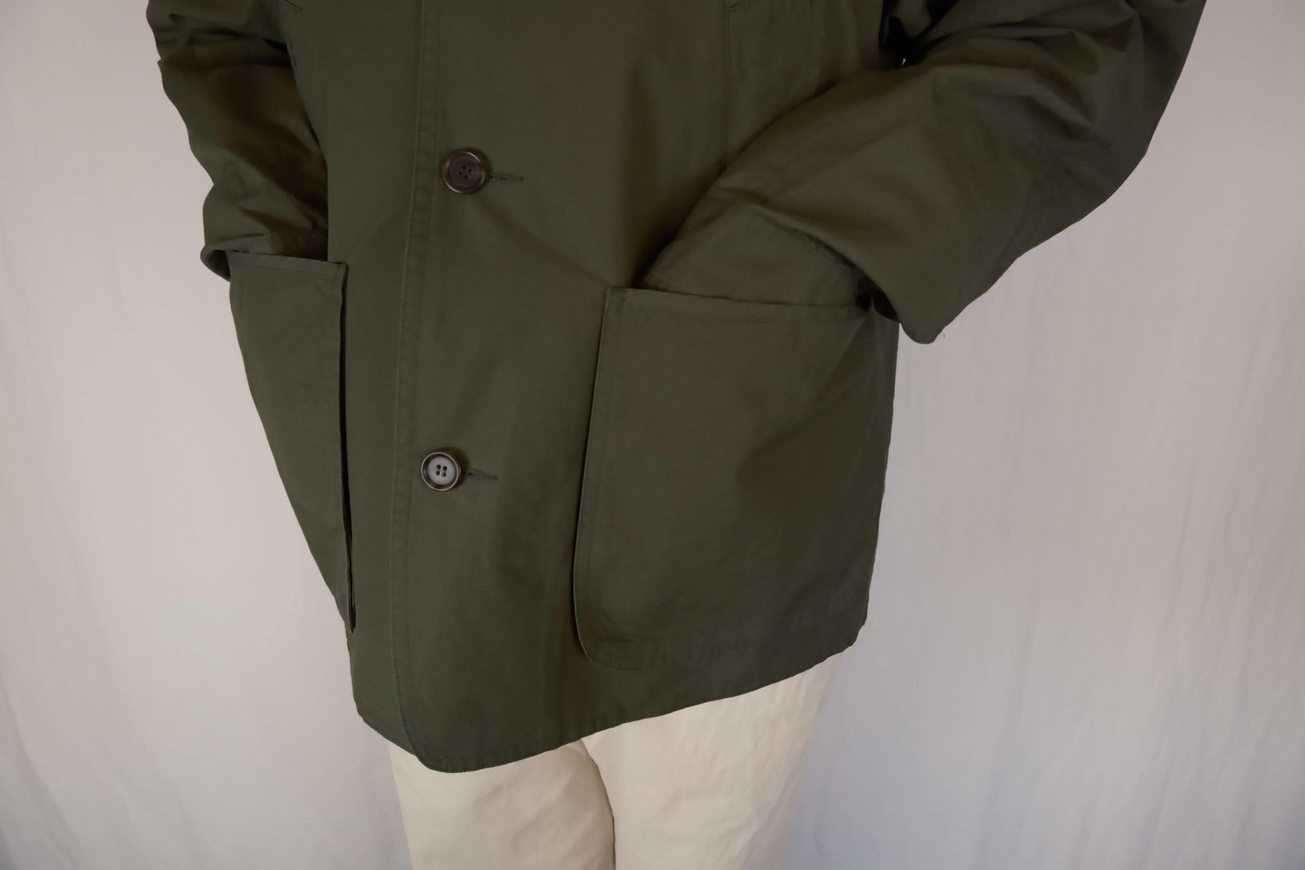 ハンティングジャケットをベースにデザインされたワークジャケット。ポケットが重なり合う独特のディテールが特徴です。裏地のない一枚仕立てで、裏地のない一枚仕立てで、春のレイヤードにも最適。