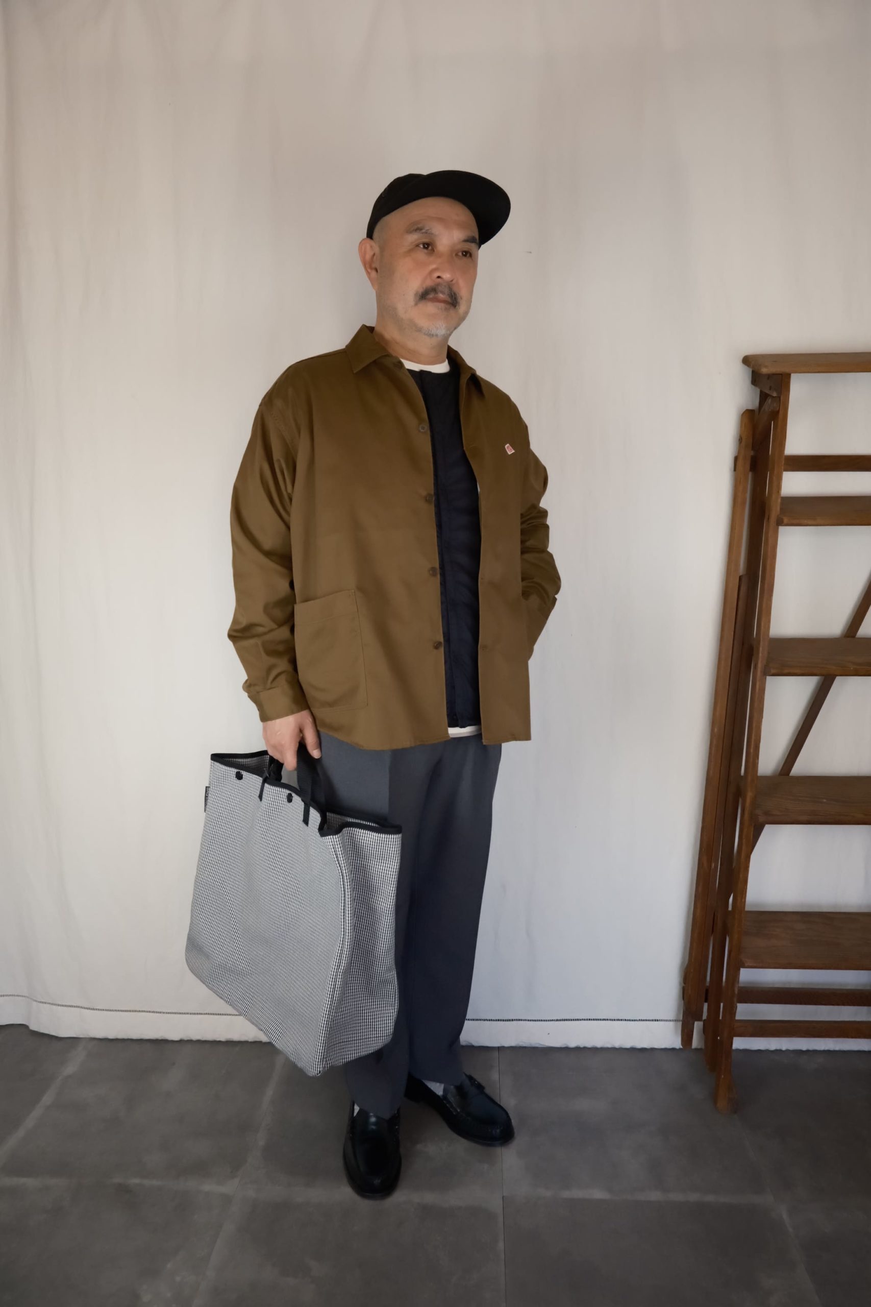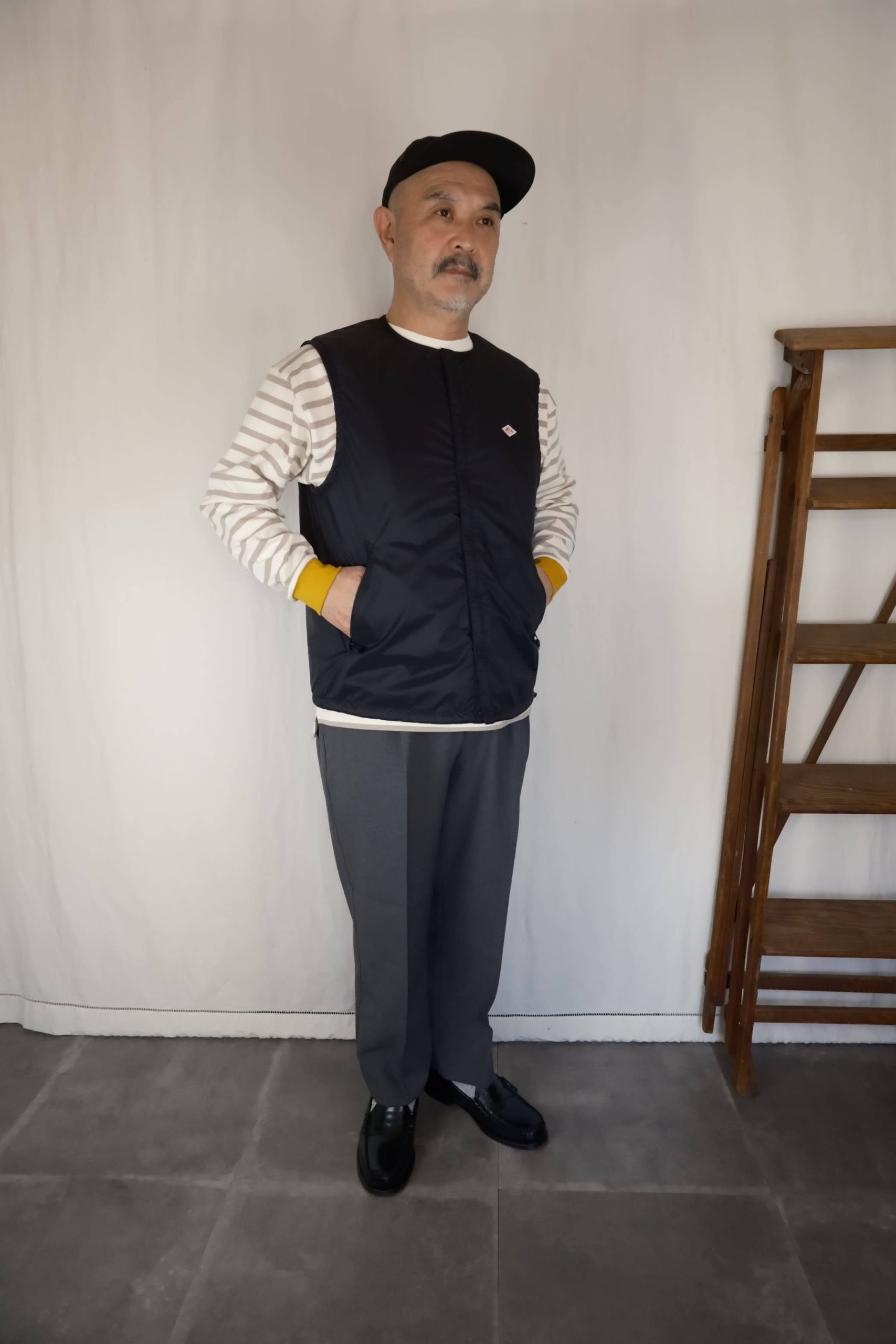 STYLE①ではワークジャケットと合わせてボリューム感のあるスタイリングでしたが、こちらではシャツジャケットと合わせてすっきりと。同じベストでも、合わせるアウターやインナー次第で印象が変わるのがレイヤードの面白さ。