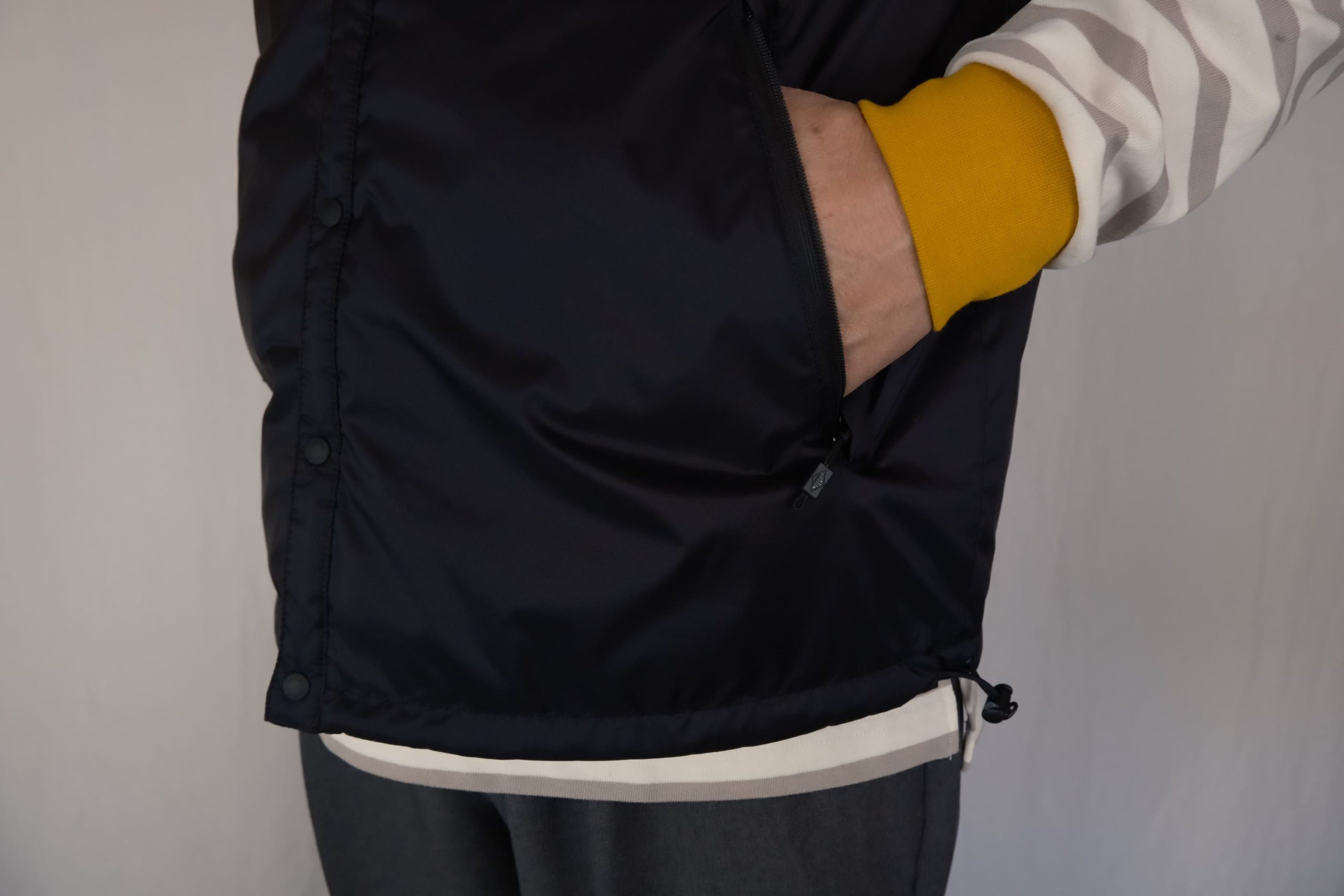 表地は細かなリップストップ柄のナイロン素材。高級感のあるマットな質感で、カジュアルになりすぎないのが魅力です。薄手なのに暖かいので、朝晩と日中の寒暖差が大きい春先のアウターとして本当に重宝する一枚です。