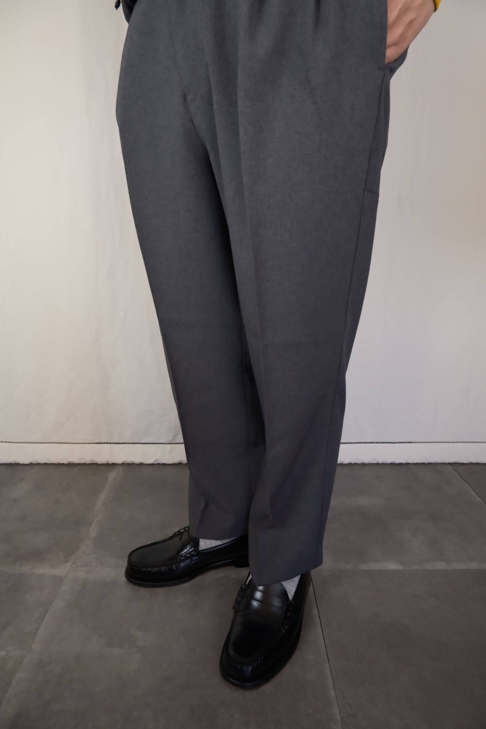 軍のオフィサーパンツをイメージしたワイドシルエット。きれいめにも見えるグレーは、今回のようなダークトーンのコーディネートにぴったりです。