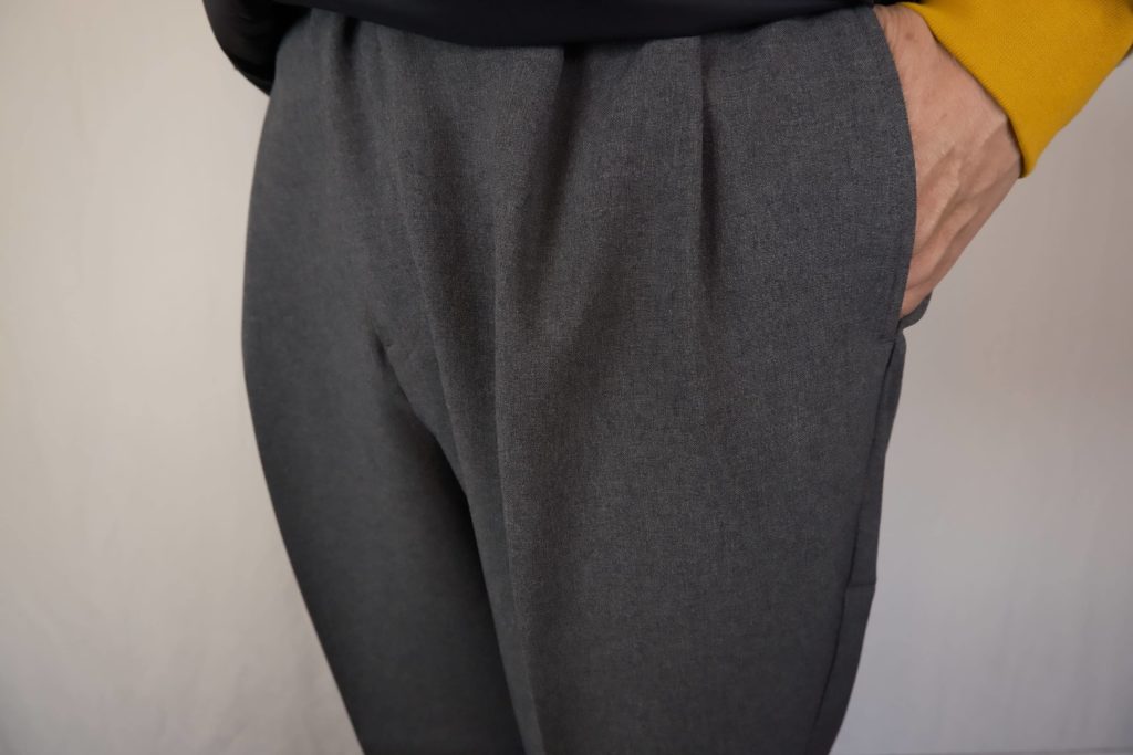 素材は綿麻ダンプ。実際に触っていただくとわかるのですが、適度な張り感がありながらも硬すぎない、絶妙な風合い。麻が入ることで生まれるドライなタッチは、汗ばむ季節にもサラッと快適。春から初夏まで長く活躍してくれる素材。