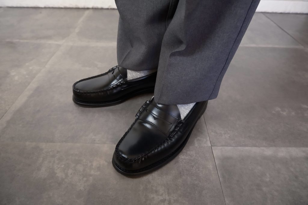 1876年にアメリカで誕生し、ローファーの代名詞として知られるG.H.BASS。その定番モデル「LARSON」は、ビーフロールと呼ばれるデザインが特徴です。サドル(甲部分のあて革)の両端をモカ縫い部分で巻き留めたようなディテールで、適度なボリューム感がカジュアルな装いにもよく合います。