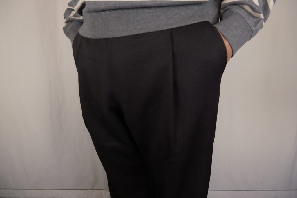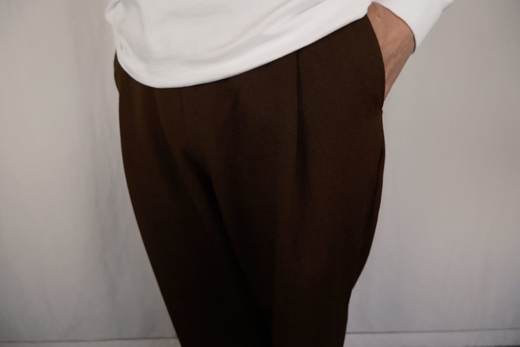 シワになりにくく、自宅でのケアも簡単。セットアップとしてはもちろん、単品使いでもスタイリングに幅をもたらす、汎用性の高いアイテムです。