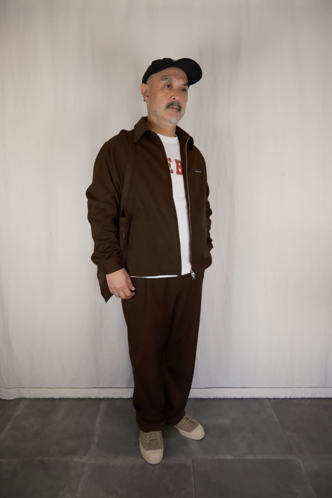 ZIPブルゾン・パンツ・バッグの3点セット。スポーティさを抑え、都会的で落ち着いた印象に仕上げました。