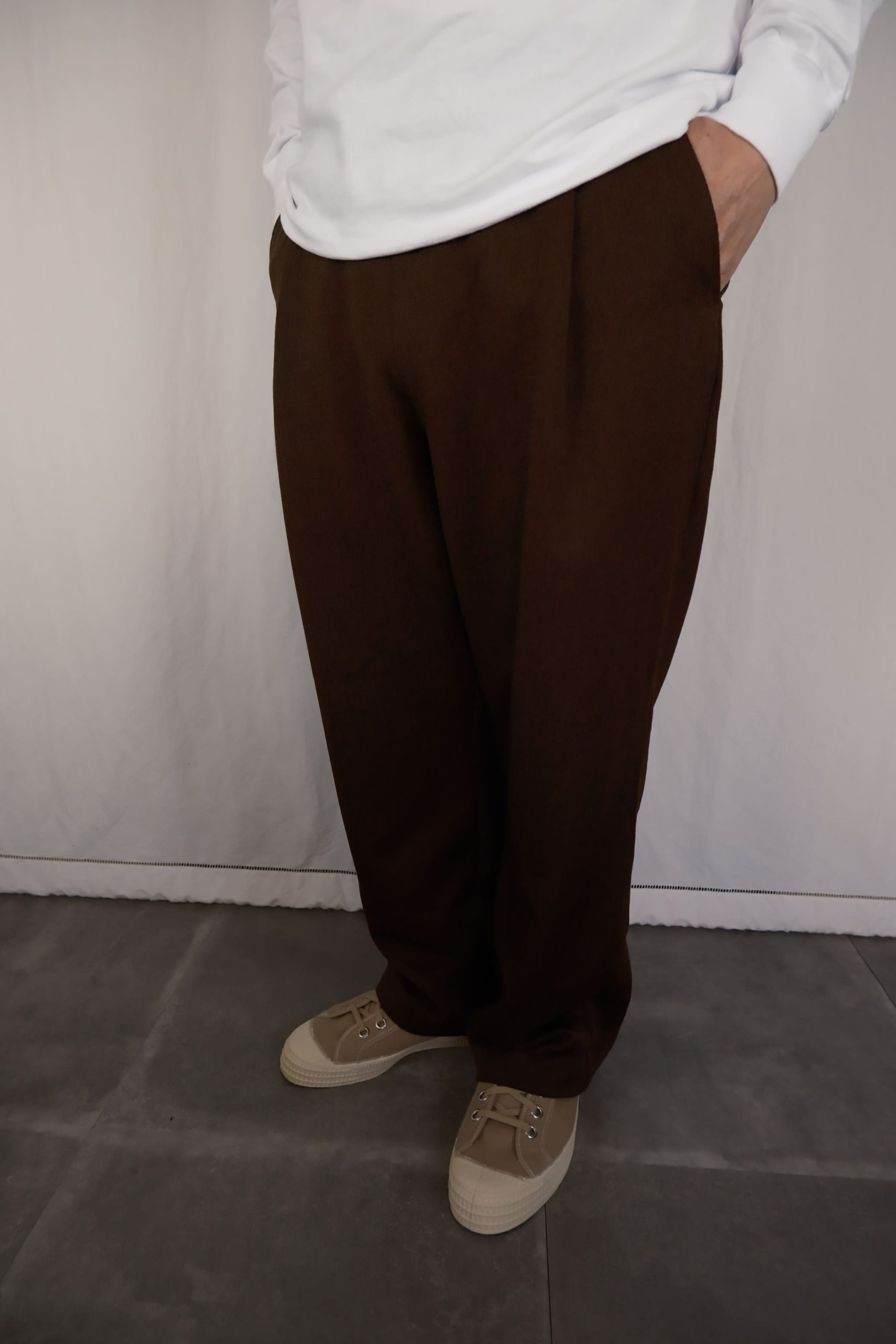 シワになりにくく、自宅でのケアも簡単。セットアップとしてはもちろん、単品使いでもスタイリングに幅をもたらす、汎用性の高いアイテムです。